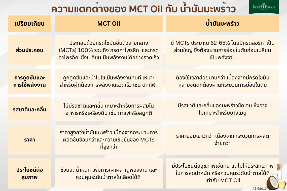 แม้ว่า MCT Oil และ น้ำมันมะพร้าว จะมีความเชื่อมโยงกันเพราะ MCT Oil ถูกสกัดจากน้ำมันมะพร้าว แต่ทั้งสองมีคุณสมบัติและประโยชน์ที่แตกต่างกันอย่างชัดเจนในแง่ของส่วนประกอบ การดูดซึม และผลลัพธ์ต่อสุขภาพ   ดังนี้