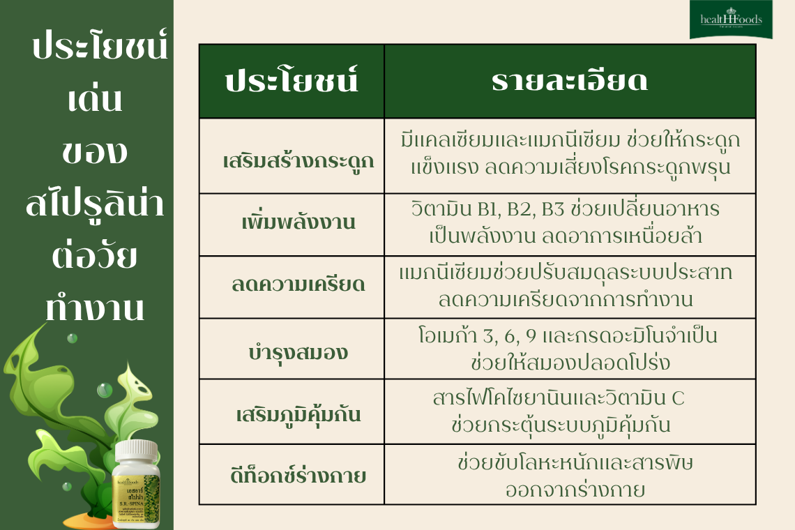 ซ่อมแซมร่างกายและภูมิต้านทาน: นอกจากเรื่องกระดูก สารอาหารในสไปรูลิน่ายังช่วยซ่อมแซมส่วนที่เสียหายของร่างกายและเสริมสร้างภูมิคุ้มกัน เมื่อสุขภาพร่างกายโดยรวมดี กระบวนการฟื้นฟูกระดูกก็ย่อมดีตามไปด้วย