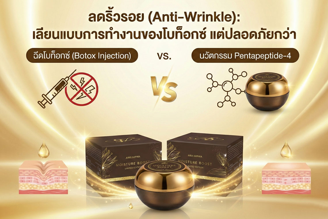 ไม่ต้องเจ็บตัวฉีดสารเคมี เพราะนวัตกรรมนี้ใช้ Pentapeptide-4 ซึ่งเป็นสารสกัดที่มีคุณสมบัติ Botox-like ทำหน้าที่ช่วยผ่อนคลายการยึดตัวของกล้ามเนื้อบนใบหน้า ทำให้ริ้วรอยร่องลึกดูตื้นขึ้นอย่างเป็นธรรมชาติ แตกต่างจากการฉีดโบท็อกซ์ตรงที่เน้นการฟื้นฟูโครงสร้างผิวให้ดีขึ้นจริงในระยะยาว ไม่ใช่แค่ผลลัพธ์ชั่วคราว