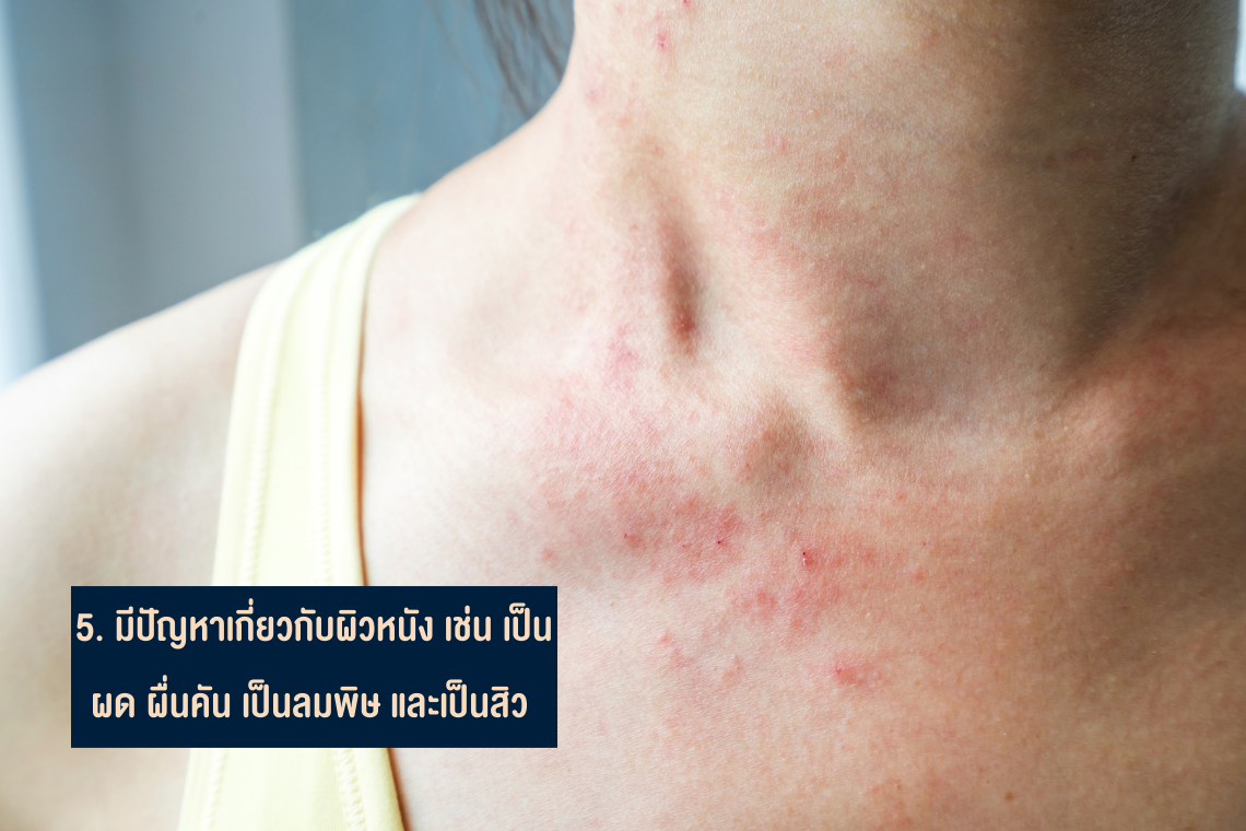 มีปัญหาเกี่ยวกับผิวหนัง เช่น เป็นผด ผื่นคัน เป็นลมพิษ และเป็นสิว