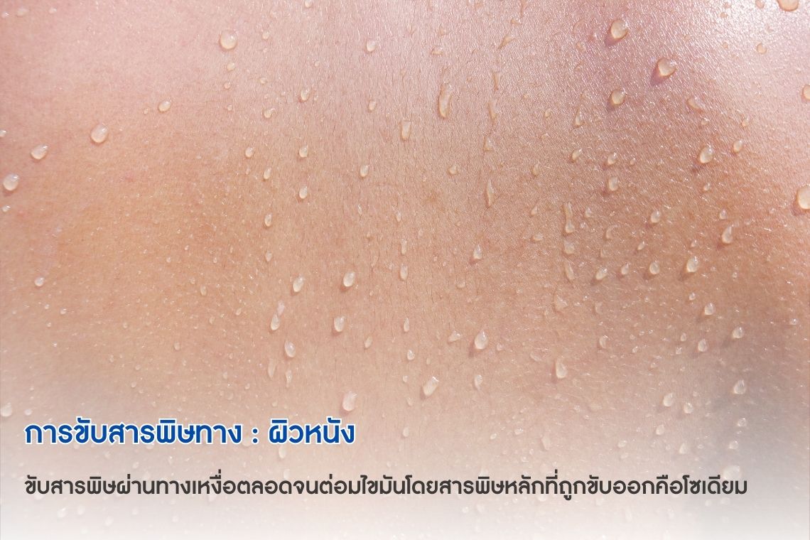 1. ผิวหนัง: ขับสารพิษผ่านทางเหงื่อตลอดจนต่อมไขมันโดยสารพิษหลักที่ถูกขับออกคือโซเดียม