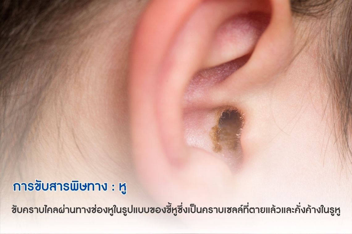 3. หู: ขับคราบไคลผ่านทางช่องหูในรูปแบบของขี้หูซึ่งเป็นคราบเซลล์ที่ตายแล้วและคั่งค้างในรูหู