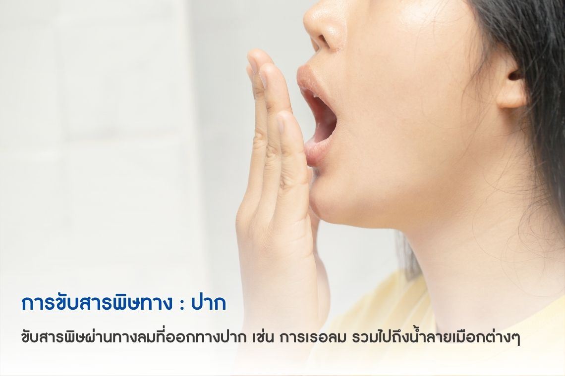 5. ปาก: ขับสารพิษผ่านทางลมที่ออกทางปาก เช่น การเรอลม รวมไปถึงน้ำลายเมือกต่างๆ