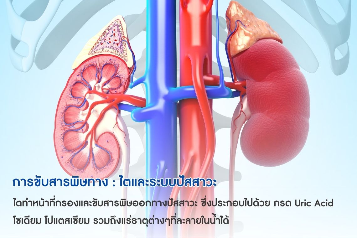 6. ไตและระบบปัสสาวะ: ไตทำหน้าที่กรองและขับสารพิษออกทางปัสสาวะ ซึ่งประกอบไปด้วย กรด Uric Acid โซเดียม โปแตสเซียม รวมถึงแร่ธาตุต่างๆที่ละลายในน้ำได้