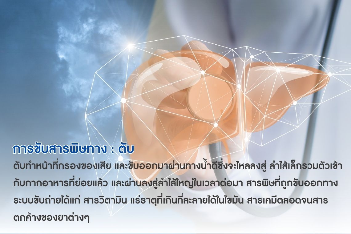 7. ตับ และระบบขับถ่าย: ตับทำหน้าที่กรองของเสีย และขับออกมาผ่านทางน้ำดีซึ่งจะไหลลงสู่ ลำไส้เล็กรวมตัวเข้ากับกากอาหารที่ย่อยแล้ว และผ่านลงสู่ลำไส้ใหญ่ในเวลาต่อมา สารพิษที่ถูกขับออกทางระบบขับถ่ายได้แก่ สารวิตามิน แร่ธาตุที่เกินที่ละลายได้ในไขมัน สารเคมีตลอดจนสารตกค้างของยาต่างๆ