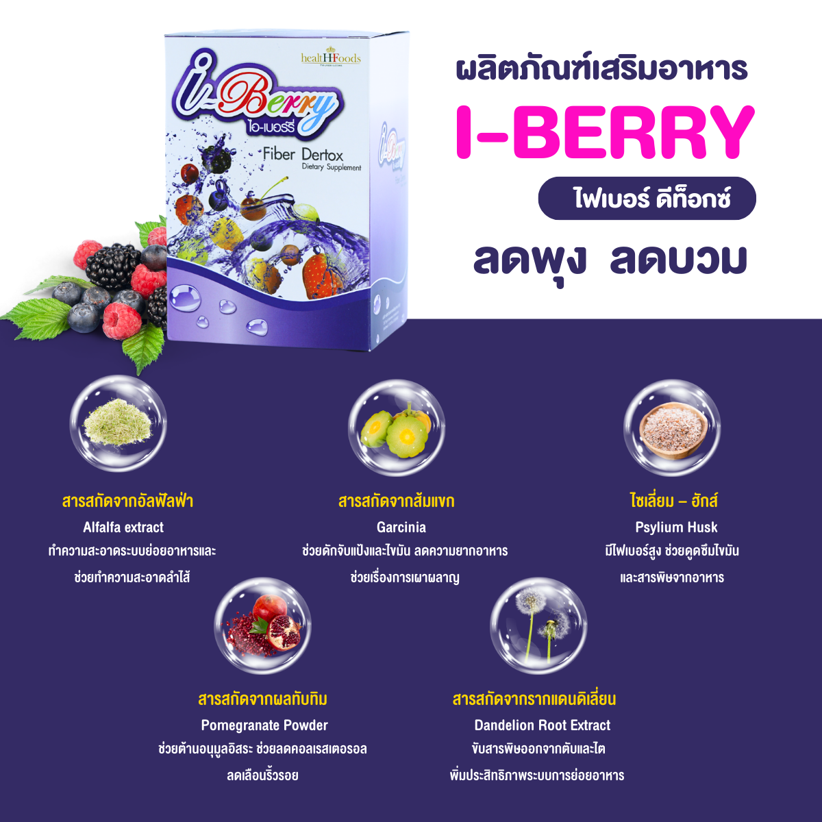 ผลิตภัณฑ์อาหารเสริมไอเบอร์รี่ไฟเบอร์ดีท๊อกซ์ มีสารสกัดจากธรรมชาติ เช่น ฟรุตโต-โอลิโกแซคคาไรด์ , สารสกัดจากส้มแขก , สารสกัดอัลฟัลฟา , ไซเลี่ยม – ฮักส์, ทั้งหมดนี้เป็นไฟเบอร์ละลายน้ำได้จะมีความสามารถในการดูดซึมน้ำได้ดีมาก ดังนั้นมันจึงถูกแปรสภาพเป็นสารคล้ายเจลลื่น ๆ ช่วยเคลือบระบบทางเดินอาหาร ทำให้ลำไส้ย่อยและดูดซึมสารอาหารได้ช้าลง และทำให้อุจจาระของเรานิ่มลง และทำการดูดซึมของเสียที่อยู่ในลำไส้ออกมาพร้อมกับระบบขับถ่ายค่ะ และไม่ทำให้ปวดบิดอีกด้วยค่ะ